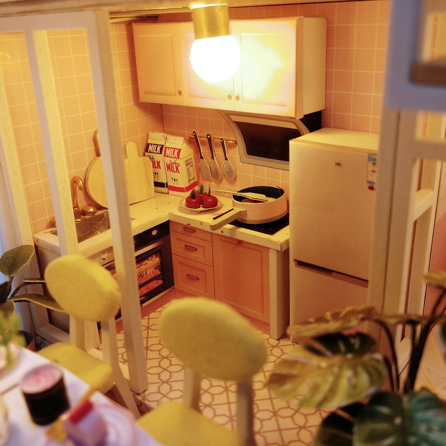 Byggesættet består af mange små dele, der samles som et puslespil. Når det er færdigbygget, får du et unikt miniature dukkehus diorama, der både kan bruges som dekorativ indretning eller som en særlig gave til en kreativ sjæl. LED-lamperne skaber ekstra hygge og gør scenen levende.