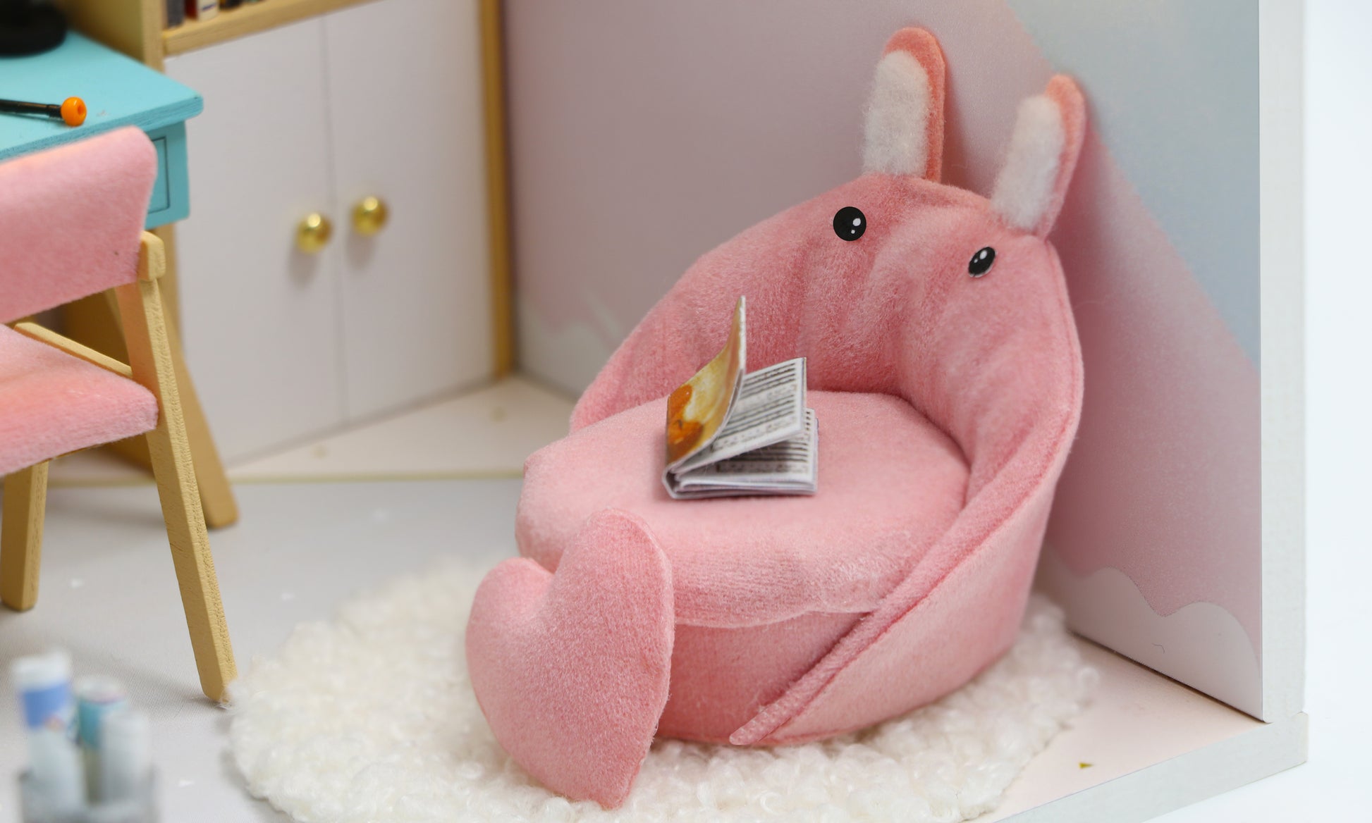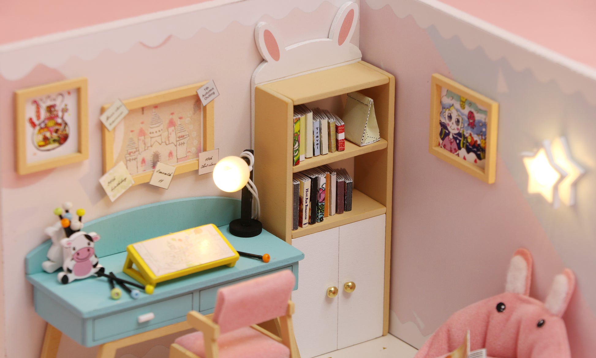 Scenen forestiller et stemningsfuldt studieværelse med skrivebord, reol, bløde møbler og søde dekorationer – alt udført i fine detaljer for at skabe en realistisk og varm atmosfære. Byggesættet består af små dele, der samles som et puslespil, og når det er færdigt, får du et unikt miniature dukkehus diorama, som både kan bruges som dekoration eller gives som en særlig gave.