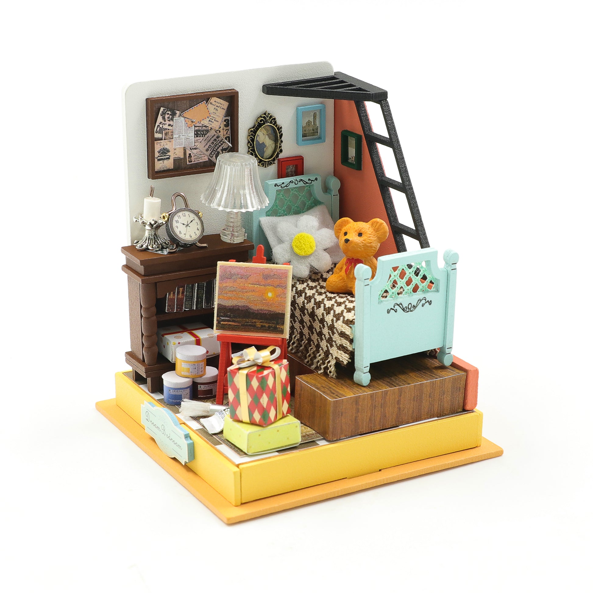Dette Craftsy DIY miniature byggesæt giver dig muligheden for at samle dit helt eget lille kunstneriske univers. Scenen forestiller et kreativt værelse med seng, bamse, bogreol, staffeli, malerier og gaver – alt sammen i miniatureformat. Hver eneste detalje er nøje udformet for at skabe en realistisk og hyggelig atmosfære.
